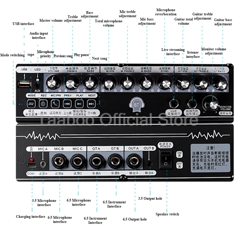 Interface: U interface, AUX interface, live streaming interface, monitoring interface, charging interface, 3.5 smartphone interface, 6.5 smartphone interface * 2 ,6.5 guitar interface * 2, 6.5 output hole, 3.5 output hole;