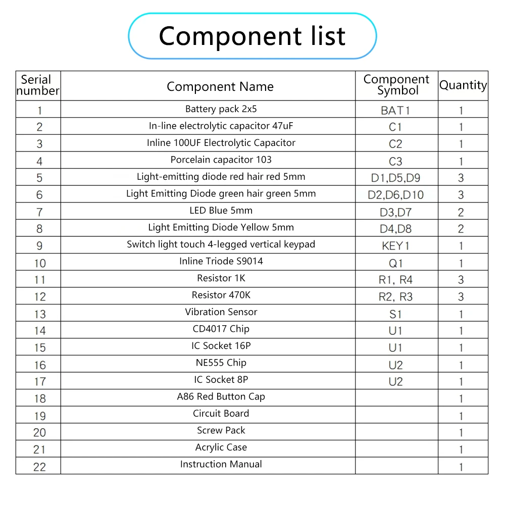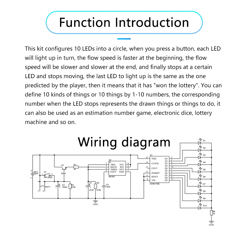 By the NE555 and CD4017 chip combination of LED random output function, the control terminal are key control, vibration switch control, just press the button or shake, LED will start to rotate, and then after a while randomly stop, leaving only one LED light shining.Package include: