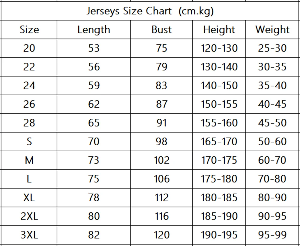 The jerseys are Asian size, Kids size 20-28 for kids youth, size S-2XL for men adult