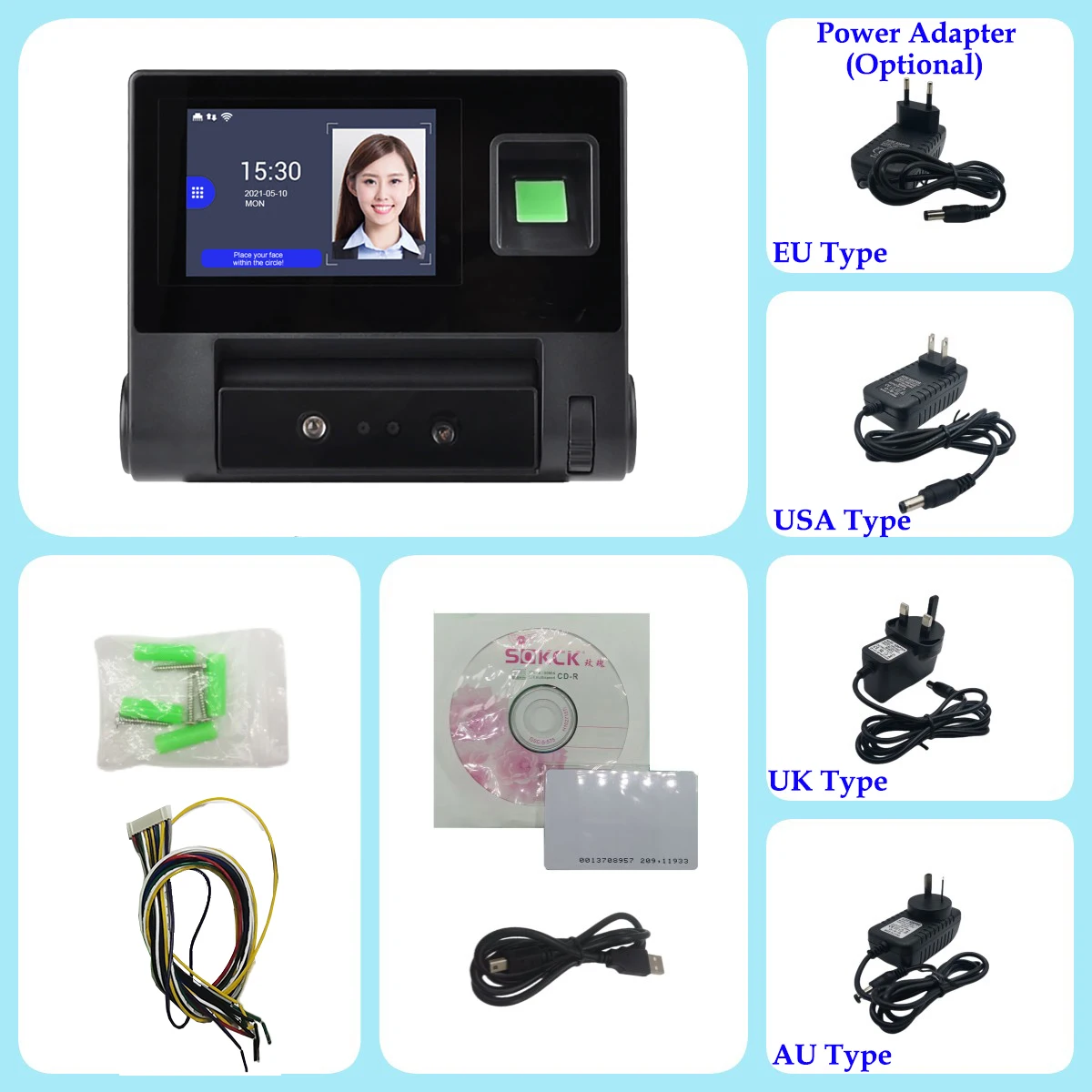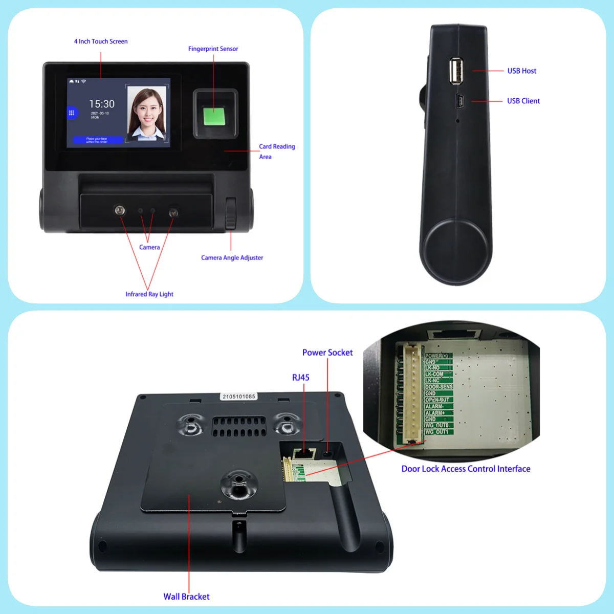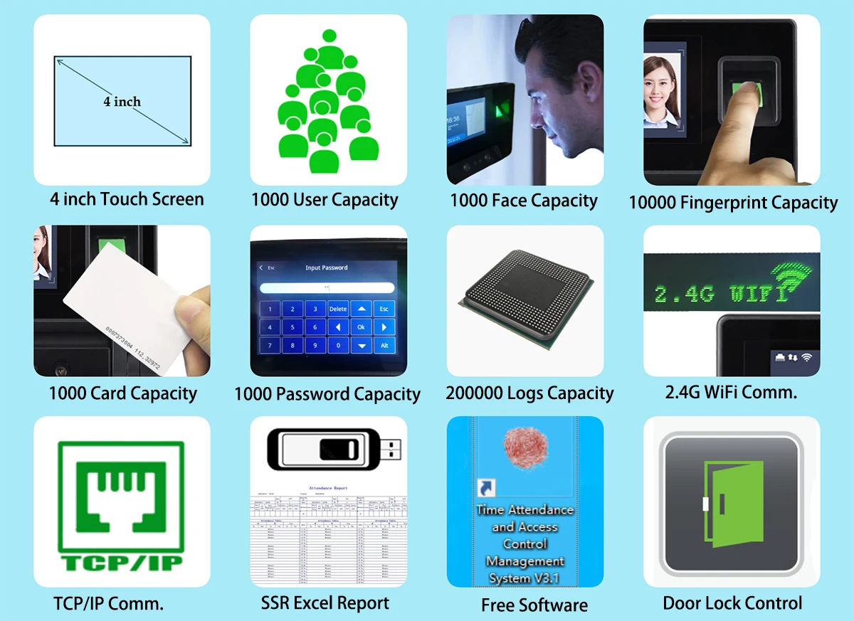 Recognition way:Face,Fingerprint,Card,password